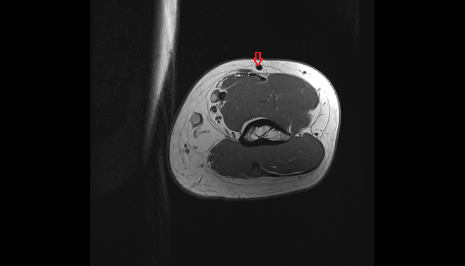 Course: Seen as a tubular soft-tissue structure along lateral upper limb, outlined by subcutaneous fat.
