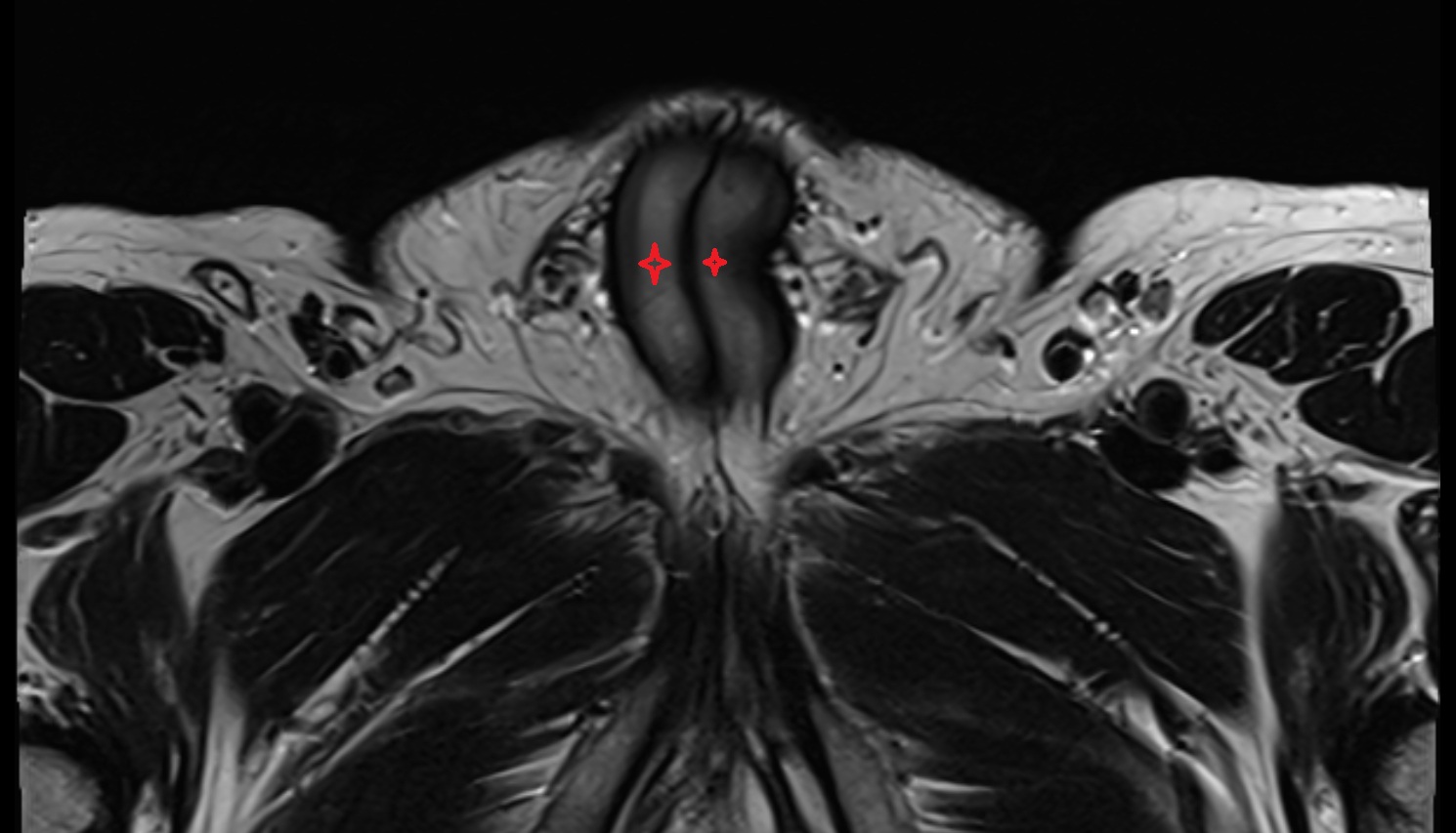 Corpus cavernosum appears with intermediate to mildly hyperintense signal compared to muscle