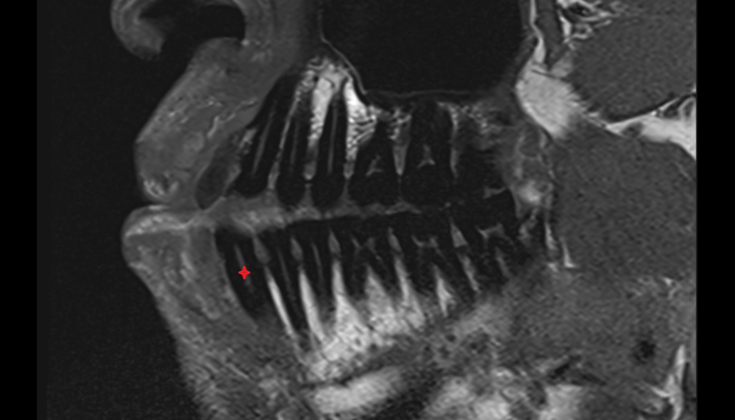 Alveolar bone appears low signal, contrasting with soft tissue
