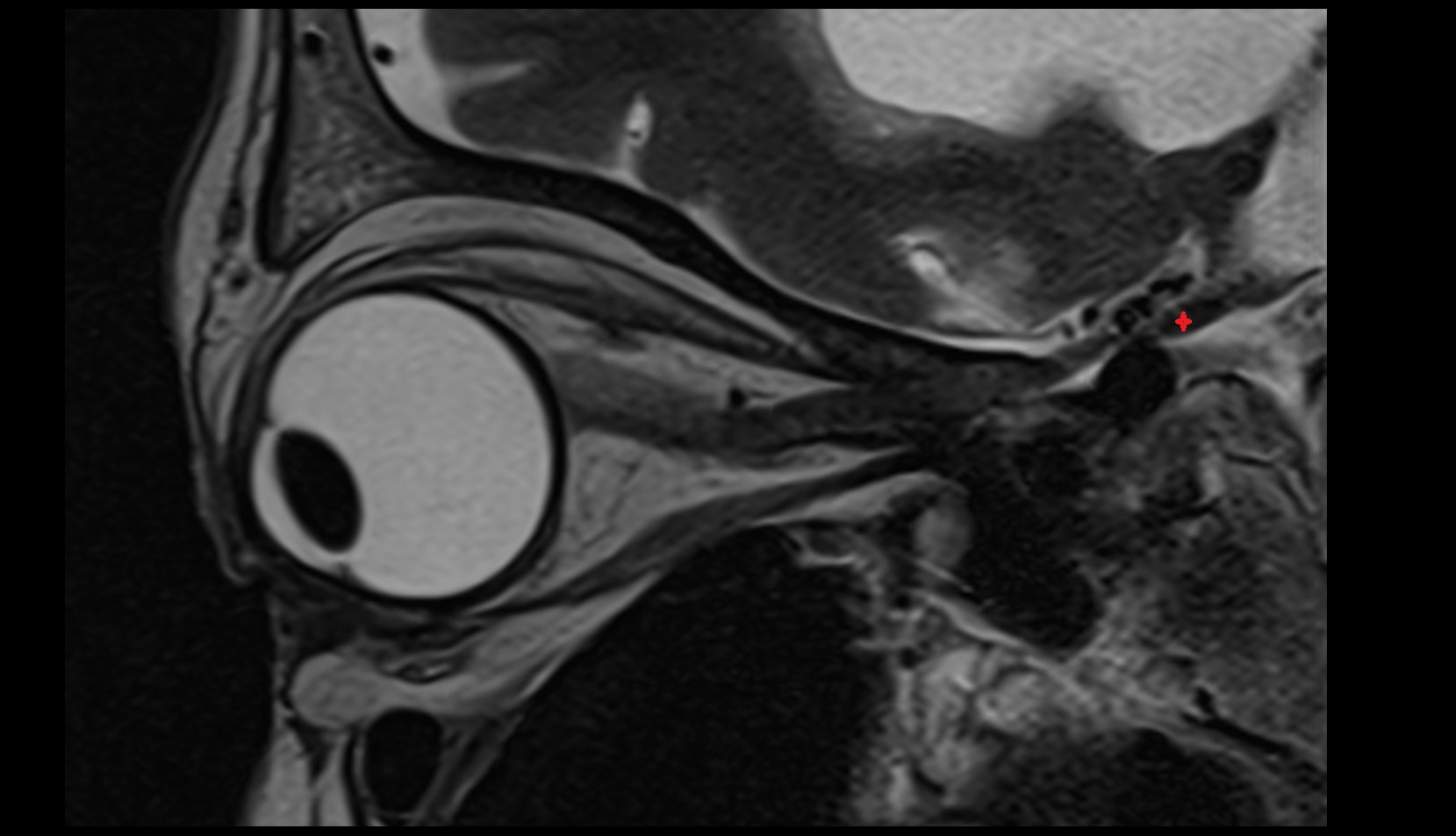 CSF surrounding the nerve appears hyperintense, outlining the nerve and optic sheath.