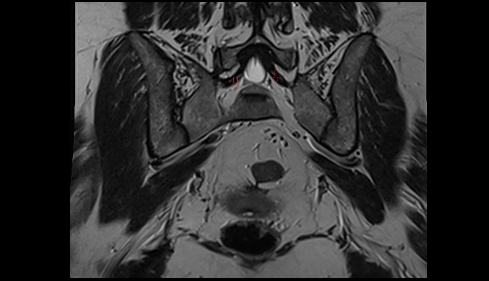 Nerves appear as thin low-to-intermediate signal linear structures within bright fat of the posterior pelvis and gluteal region