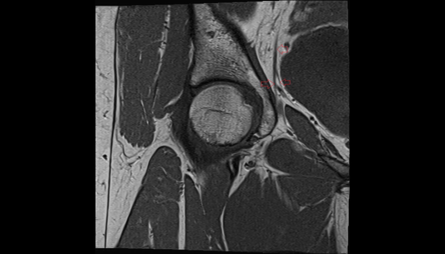 Shows obturator neuropathy as bright signal in the nerve and surrounding soft tissues.