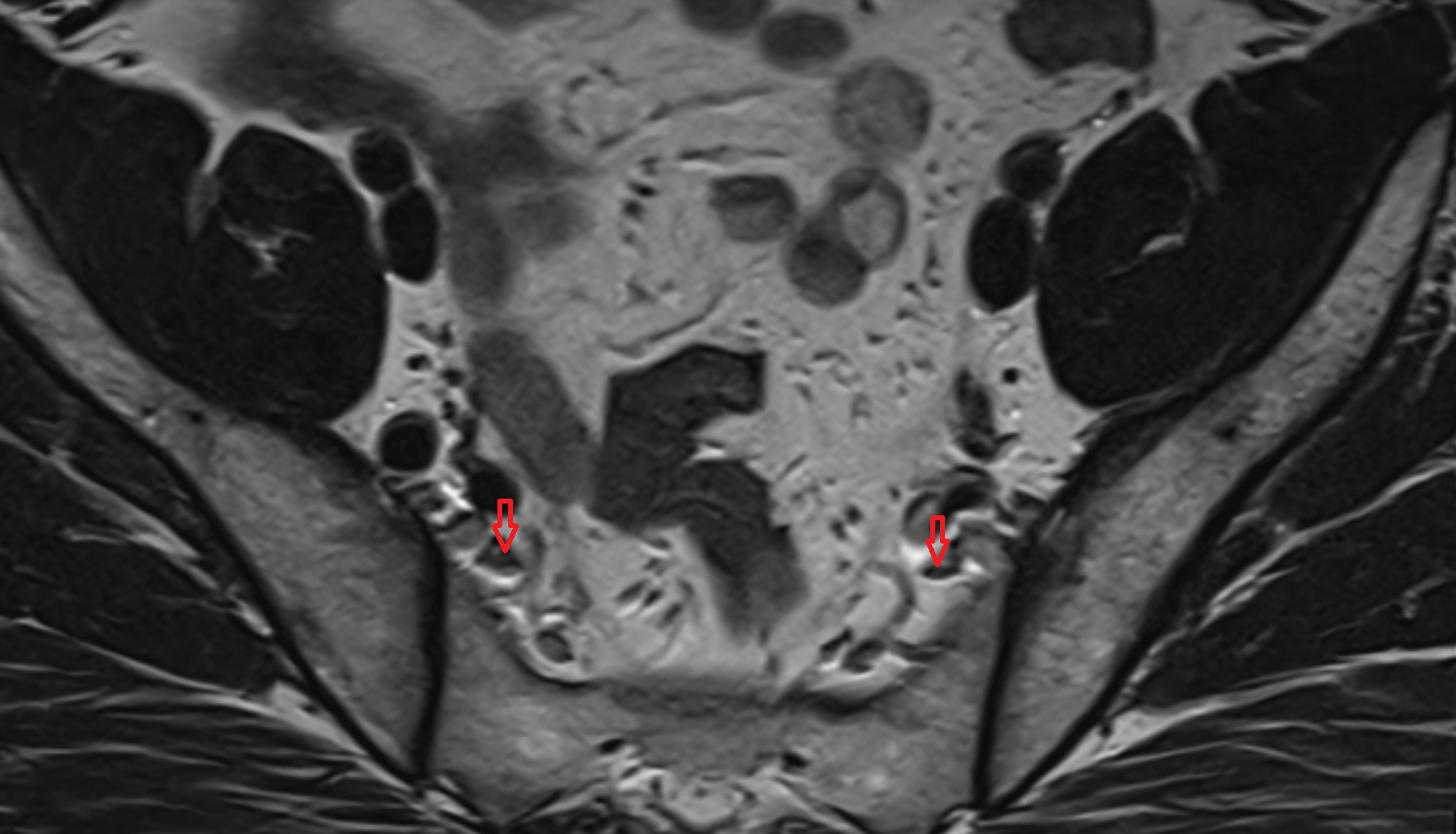 Sacral plexus roots and trunks appear as low-to-intermediate signal intensity structures