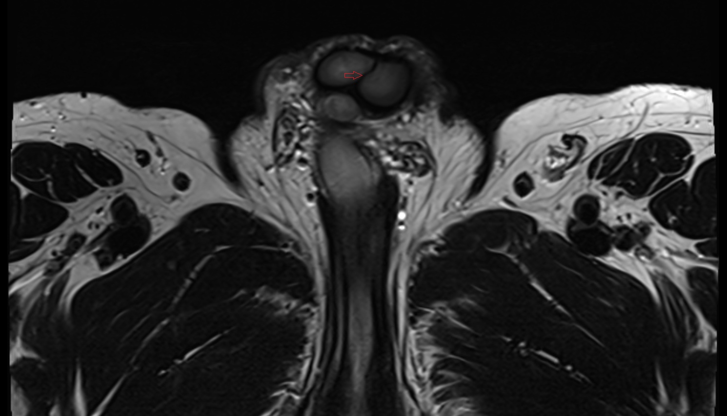 Septum appears as a thin hypointense line with clear separation of the two corpora cavernosa