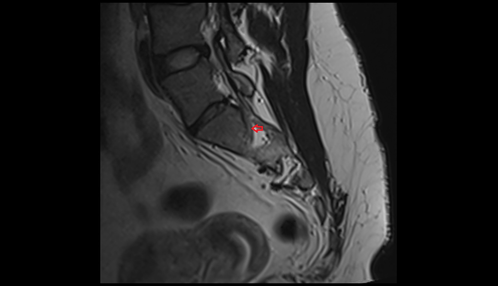 Root not directly seen; inferred at the S1–S2 sacral foramen