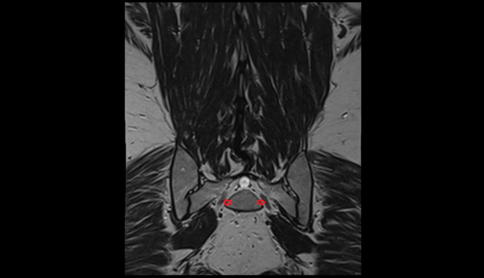 Surrounded by bright CSF in the sacral canal, making its origin and foraminal exit at S2 clearly visible
