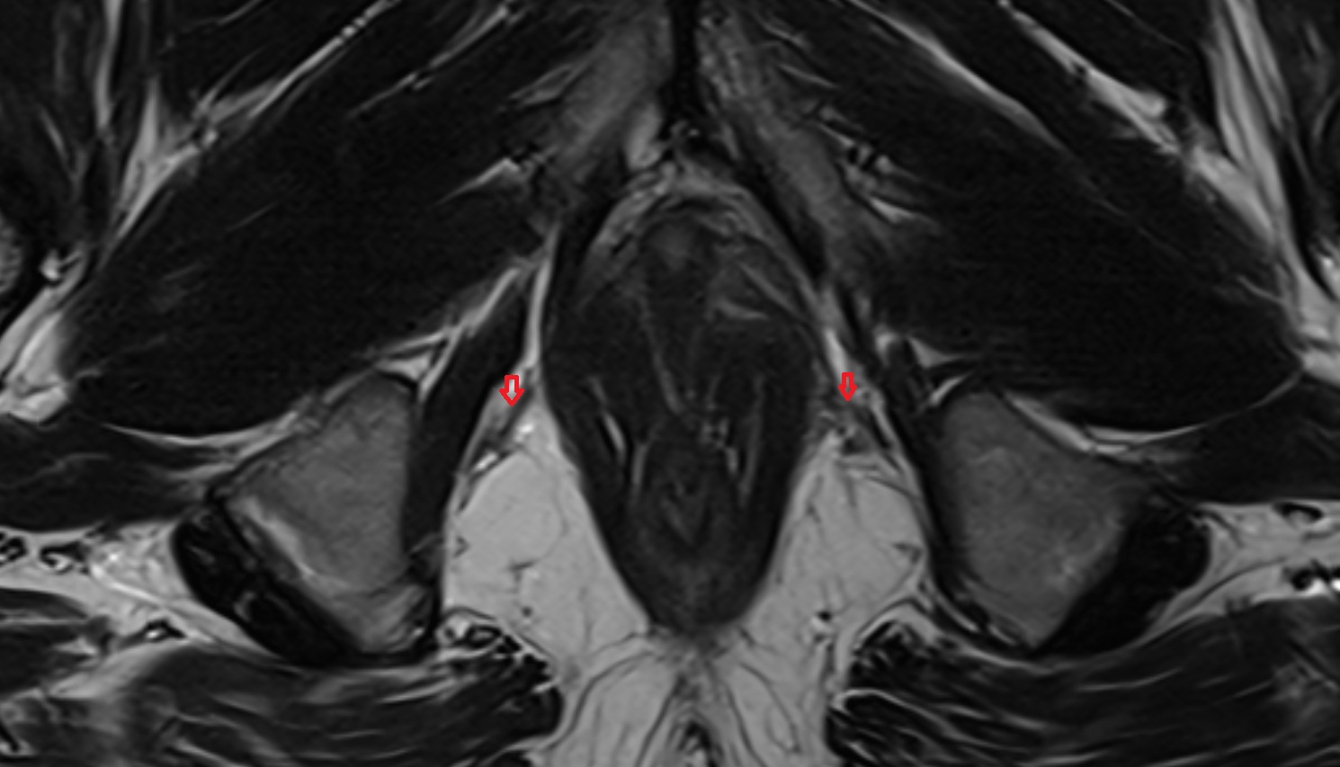 Muscle appears as a low-to-intermediate signal band in the perineal region