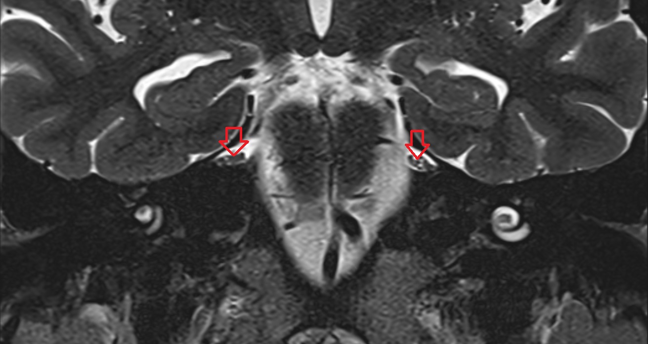 Meckel’s cave itself is seen as a CSF-filled cavity at the petrous apex of the temporal bone.